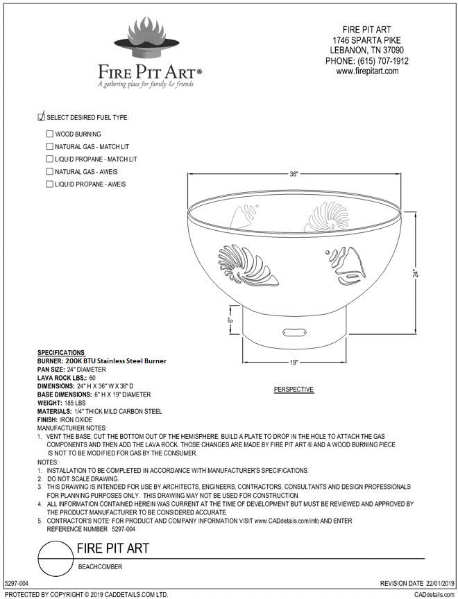 Fire Pit Art Beachcomber is constructed from heavy-duty 1/4"-thick mild carbon steel so that you can enjoy a long-lasting and durable fire pit for years to come. The inner bowl has a high-temperature-resistant coating and a rain drain with a diameter of 1 ½". The outer iron oxide patina is maintenance-free, and the fire pit can be left outside in all weather conditions. A numbered brass plate on the base of the fire pit showcases a unique number, signifying it has been handmade exclusively for you.