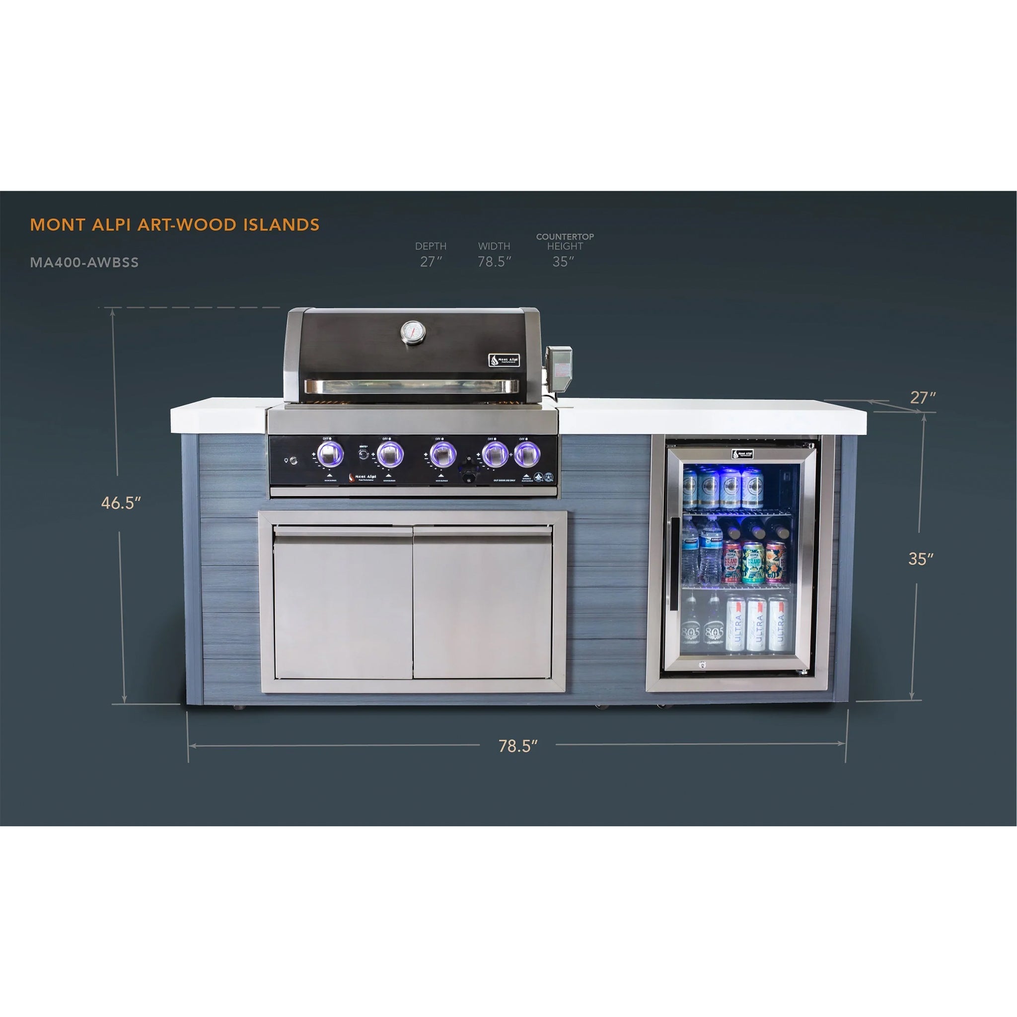 Discover the perfect blend of style and functionality with the Mont Alpi MA400-AWBSS Artwood Grill Island. This beautifully crafted grill island features cabinetry manufactured from recycled artwood, designed to last forever, UV-protected, rust-free, and easy to clean.