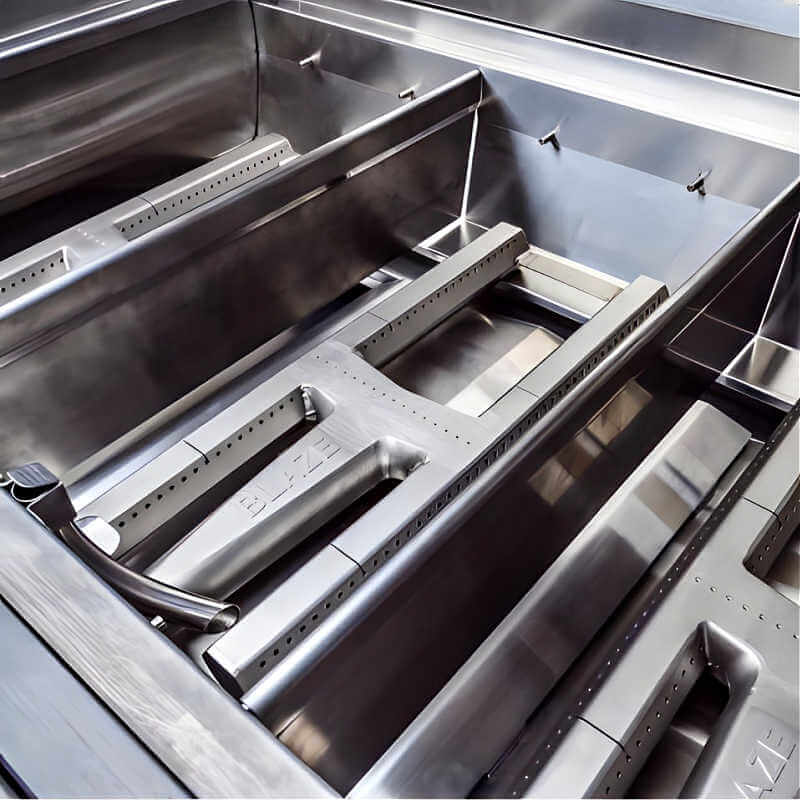 Above your flame tamers sits the patented Blaze 12mm hexagon-shaped grill grates. The oversized grill grates are designed to maximize the surface area when grilling to ensure even grilling of your food above. Their wide surface area also reduces food from falling through and provides a non-stick surface that allows you to grill delicate food, like your favorite grilled fish or asparagus right on your grill grates. The 12mm design increases heat retention given your grill surface, even heat distribution and being able to maintain these grill temperatures throughout the whole cookout.